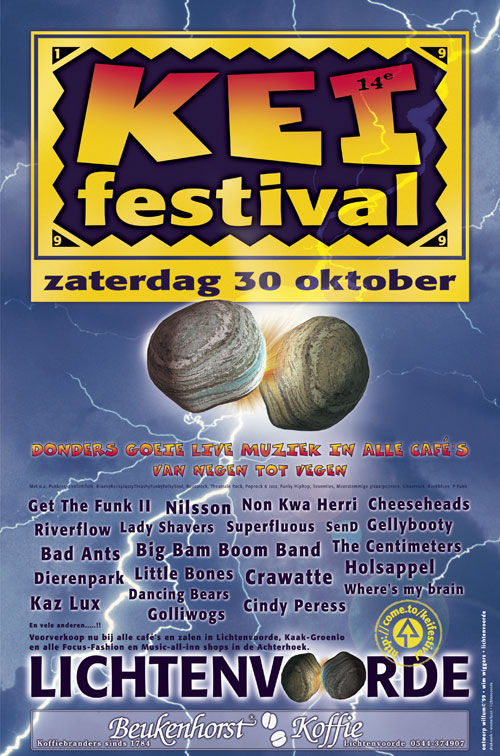 GET THE FUNK II, NILSON, NON KWA HERRI, CHEESEHEAD, RIVERFLOW, LADY SHAVERS, SUPERFLUOUS, SEND, GELLYBOOTY, BAD ANTS, BIG BAM BOOM BAND, THE CENTIMETERS, DIERENPARK, LITTLE BONES, CRAWATTE, HOLSAPPEL, KAZ LUX, DANCING BEARS, GOLLIWOGS, CINDY PERESS, WHERE’S MY BRAIN