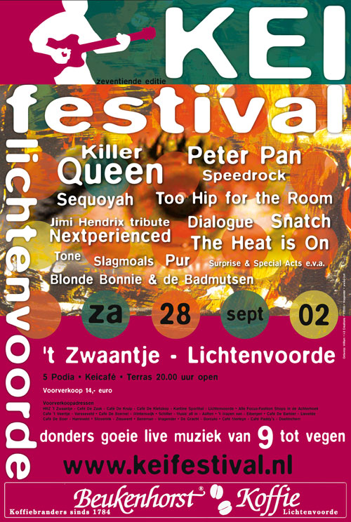 KILLER QUEEN, PETER PAN SPEEDROCK, SEQUOYAH, TOO HIP FOR THE ROOM, JIMI HENDRIX TRIBUTE, NEXPERIENCE, DIALOGUE, SNATCH, THE HEAT IS ON, SLAGMOALS, BLONDE BONNIE EN DE BADMUTS