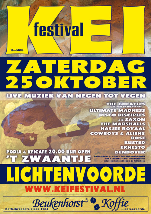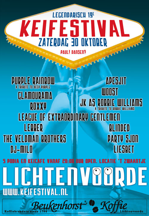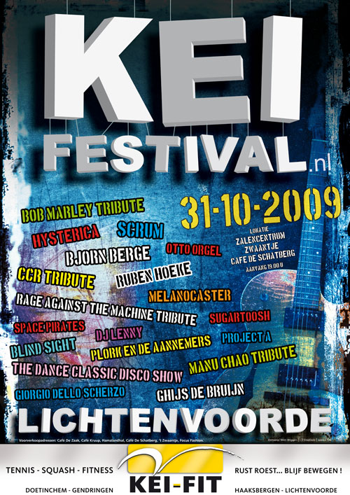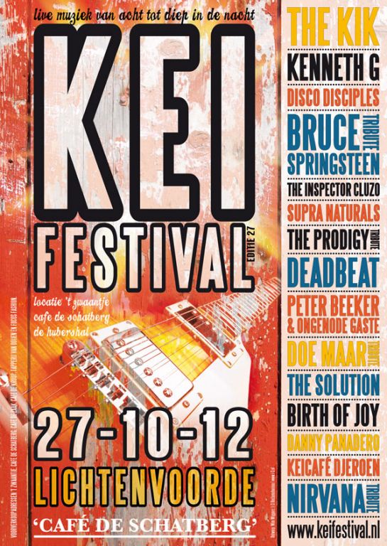 THE KIK, KENNETH G, DISCO DISCIPLES, BRUCE SPRINGSTEEN TRIBUTE, THE INSPECTOR CLUZO, SUPRA NATURALS, THE PRODIGY TRIBUTE, DEADBEAT, PETER BLEEKER & ONGENODE GASTE, DOE MAAR TRIBUTE, THE SOLUTION, BIRTH OF JOY, DANNY PANADERO, DJEROEN, NIRVANA TRIBUTE.