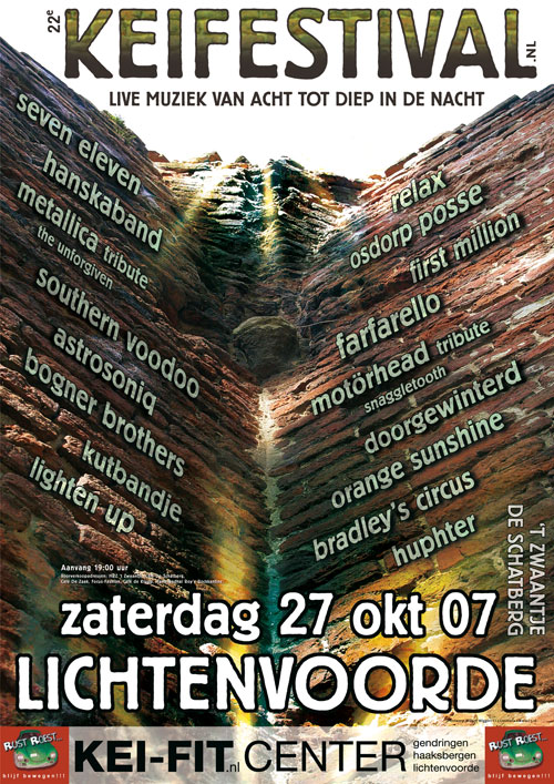 SEVEN ELEVEN, HANSKA DUO, METALLICA TRIBUTE, THE UNFORGIVEN, SOUTHERN VOODOO, ASTROSONIQ, BOGNER BROTHERS, KUTBANDJE, LIGHTEN UP, RELAX, OSDORP POSSE, FIRST MILLION, FARFARELLO, MOTORHEAD TRIBUTE, SNAGGLETOOH, DOORGEWINTERD, ORANGE SUNSHINE, BRADLEY’S CIRCUS, HUPHTER