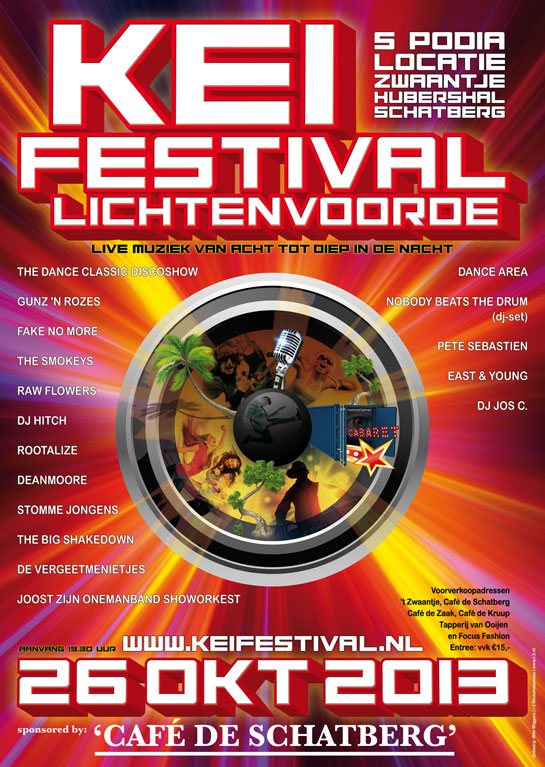 NOBODY BEATS THE DRUM (DJ-SET), PETE SEBASTIEN, EAST & YOUNG, DJ JOS C., THE DANCE CLASSIC DISCOSHOW, GUNZ ‘N ROZES, FAKE NO MORE, THE SMOKEYS, RAW FLOWERS, DJ HITCH, ROOTALIZE, DEANMOORE, STOMME JONGENS, THE BIG SHAKEDOWN, DE VERGEETMENIETJES, JOOST ZIJN ONEMANBAND SHOWORKEST.