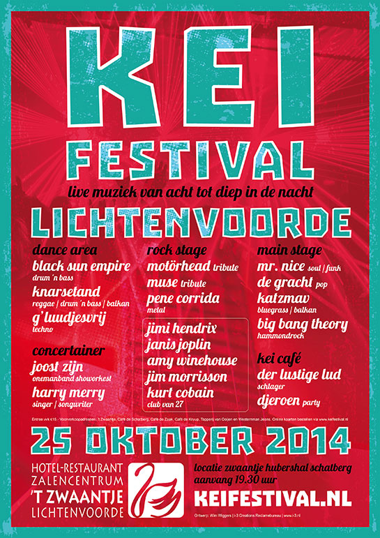 G’LUUDJESVRIJ, KNARSETAND, BLACK SUN EMPIRE, BIG BANG THEORY, KATZMAV, DE GRACHT, MR. NICE, CLUB VAN 27 (JIMI HENDRIX / JANIS JOPLIN / AMY WINEHOUSE / JIM MORRISSON / KURT COBAIN), PENE CORRIDA, MUSEST (MUSE TRIBUTE), MOTÖRHEAD TRIBUTE, DJEROEN, DER LUSTIGE LUD, JOOST ZIJN ONEMANBAND SHOWORKEST, HARRY MERRY.