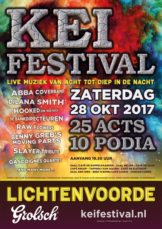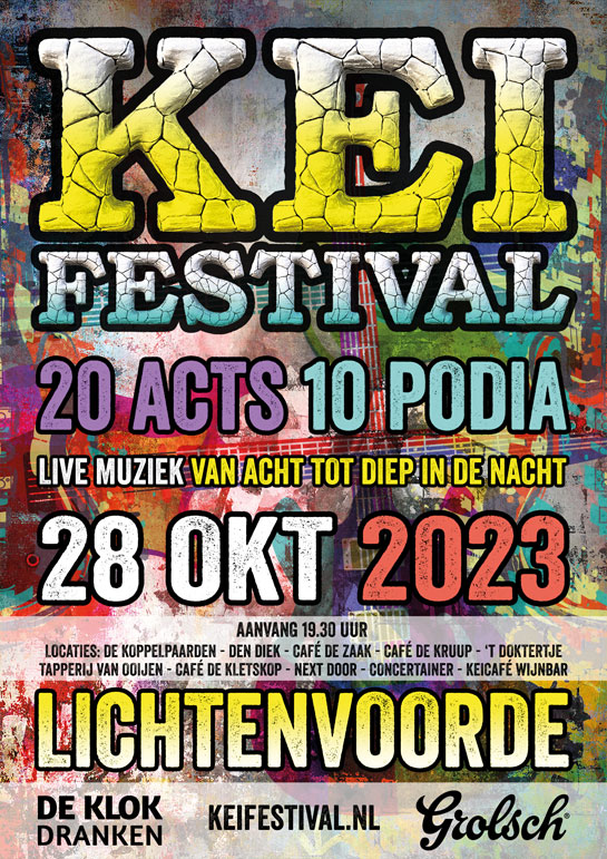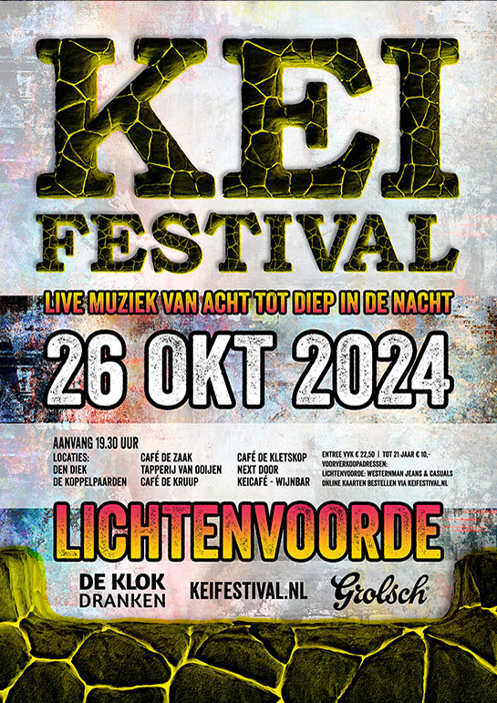 DOPPEN’S TEXTIEL, AL HOLLIDAY AND THE EAST SIDE, DAYZEE, DELAY, BONGLOARD, LORD BISHOP (USA), MORGANE YOUNG BEEZOOZ AND PHONK ADDICTION, PEARL DAMN: PEARL JAM TRIBUTE, EAGLES TRIBUTE, SOULARVIBE & THE GALAXY HORNS, G.O.D, THRASHCAN, NIRFOONA: FOO FIGHTERS EN NIRVANA TRIBUTE, KNAL-KEI-BUNKER, THE GIVEN HORSE XL, THE AMEEZING CONTAINER KARAOKEBAR, DRUNKEN DOLLY, HUUB&HENK UNPLUGGED.
