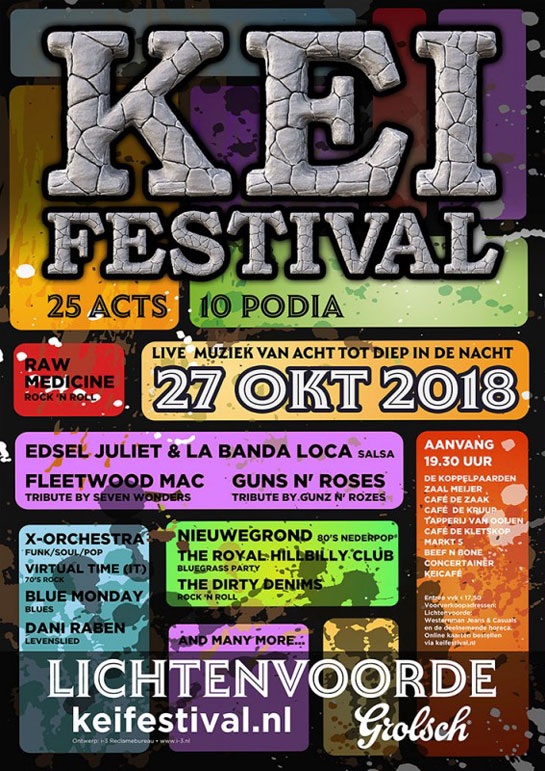 NIEUWEGROND, GUNS N’ ROSES - TRIBUTE BY GUNZ N’ ROZES, EDSEL JULIET & LA BANDA LOCA, THE VAULT, VIRTUAL TIME (IT), THE DIRTY DENIMS, TIM & NIEK, EXIT THE HIVE, THE ROYAL HILLBILLY CLUB, DANI RABEN, BLUE MONDAY, RAW MEDICINE, DE BANKDIRECTEUREN, UPPY, R.E.M. FOREVER 27 - RONALD FRENKEN EN MARK TE BRAKE.
